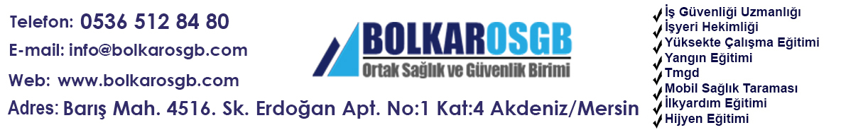 OSGB | BOLKAR ORTAK SAĞLIK GÜVENLİK BİRİMİ | BARIŞ MH. 4516. SK. ERDOĞAN APT. NO:1 Kat:4 AKDENİZ/ MERSİN | |