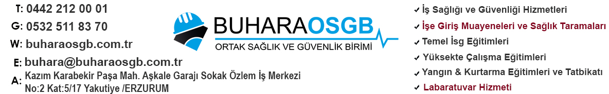 | OSGB | BUHARA ORTAK SAĞLIK GÜVENLİK BİRİMİ EĞİTİM DANIŞMANLIK | KAZIM KARABEKİR PAŞA MAH. AŞKALE GARAJI SK.ÖZLEM İŞ MERKEZİ NO:2 K:5/17 YAKUTİYE/ERZURUM