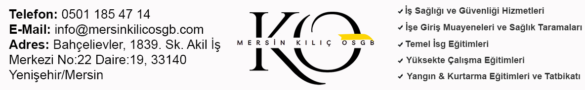 | OSGB | MERSİN KILIÇ ORTAK SAĞLIK BİRİMİ EĞİTİM DANIŞMANLIK SAN.TİC.LTD.ŞTİ. | BAHÇELİEVLER MAH. 1839 SK. NO:22 D:19 YENİŞEHİR/MERSİN | 05011854714 |
