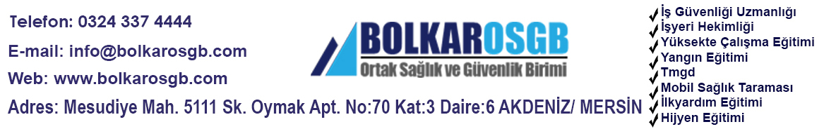 | OSGB | BOLKAR ORTAK SAĞLIK GÜVENLİK BİRİMİ | MESUDİYE MH. 5111 SK. OYMAK APT. NO:70 Kat:3 D:6 AKDENİZ/ MERSİN | 05365128480 |