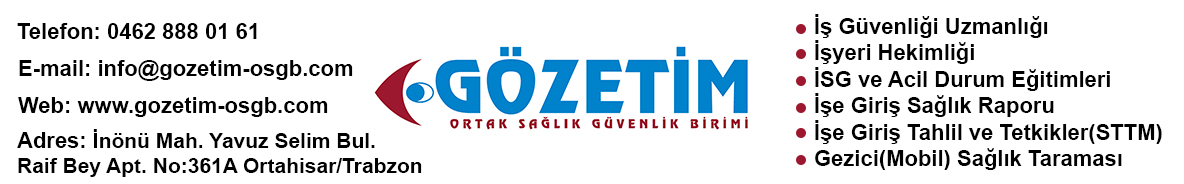 | OSGB | GÖZETİM ORTAK SAĞLIK GÜVENLİK BİRİMİ | İNÖNÜ MAH. YAVUZ SELİM BULV. RAİF BEY APT. NO:361A ORTAHİSAR/TRABZON | 04628880161 |